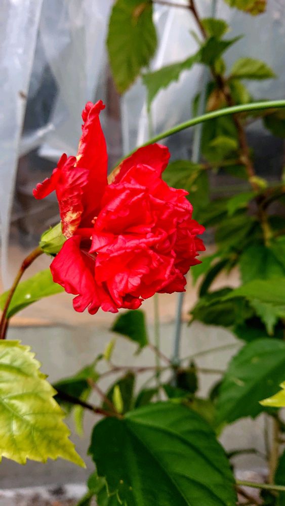 二段咲きのハイビスカスですが、夏のような大きさにはなりませんが、霜よけのためビニールをかぶせているので、2輪咲いていました🌺