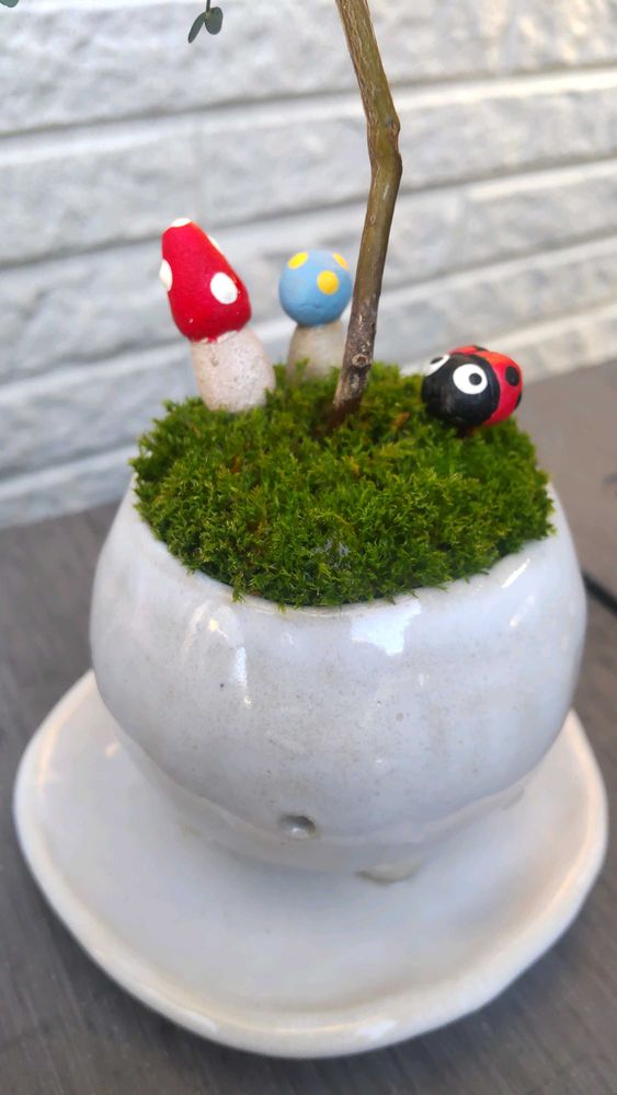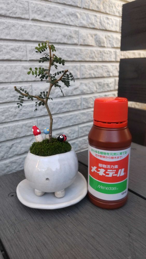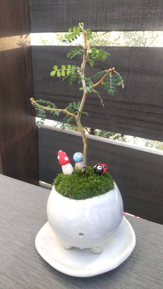 ついきすとーぶさんでミニ鉢と受け皿を購入。挿し木で育てたソフォラを盆栽風に植えて、これまたついきすとーぶさんのミニピックで飾り付け😊