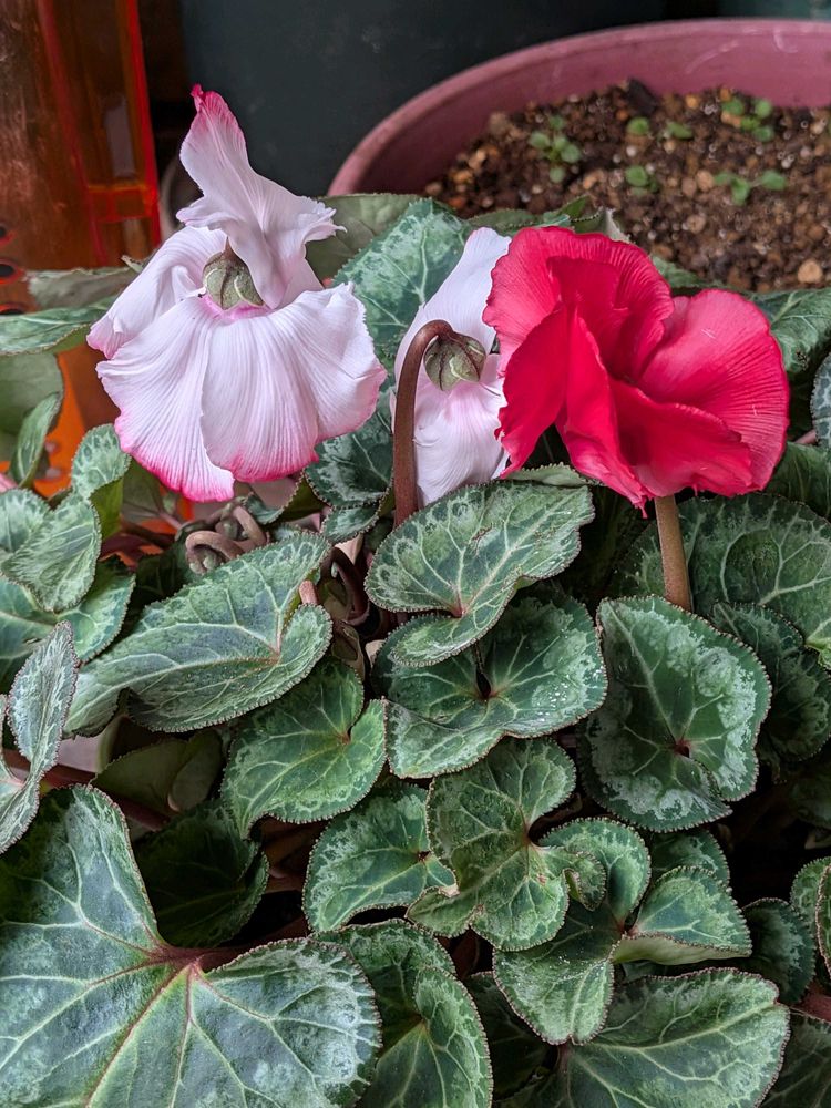 3年目のシクラメン。白地にピンクの縁取りなんだけど何故か赤い花が咲いた😅