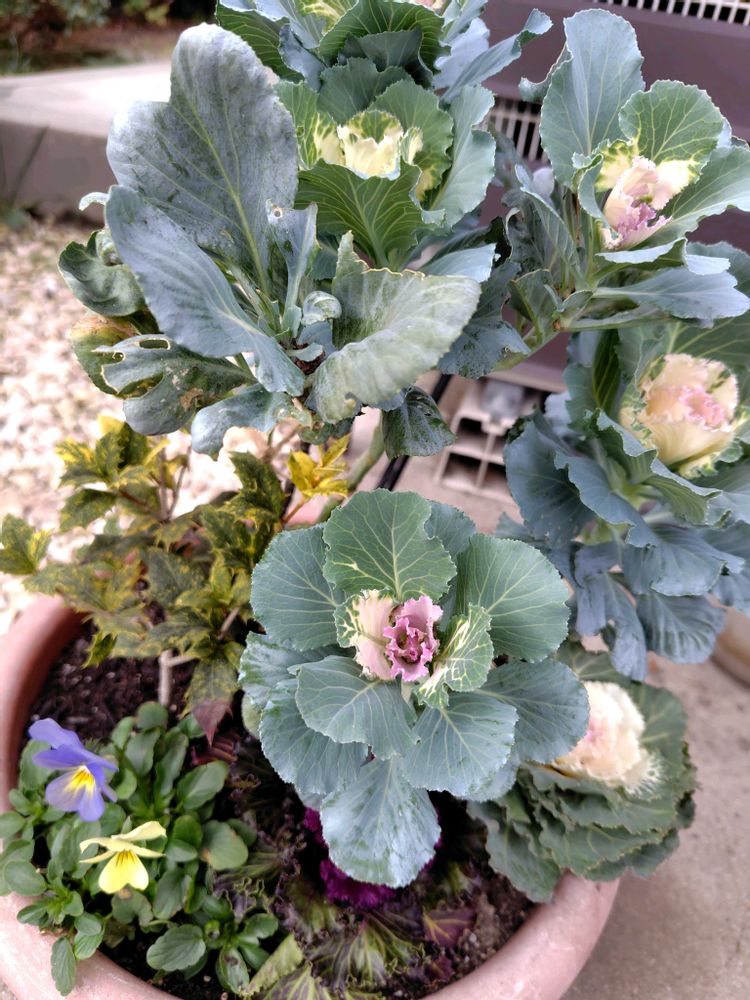 冬に元気な葉牡丹とパンジービオラたちね🌸🌿