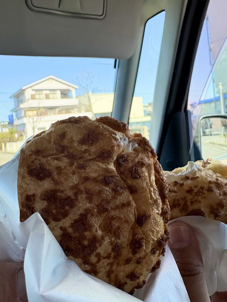 ⑤帰りの車内、シュークリームで長女と乾杯! 『北海道産の生クリームをその場で入れてくれるお店』っていう誘惑に勝てる人、この世の中にいるのかな?😅💦