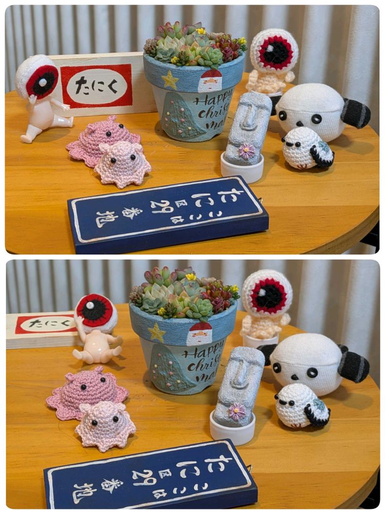 ③④ひゃー間違えて石の日にトトロちゃん載せちゃって〜〜ありゃありゃで、イリュージョンドリームがもこもこ可愛くなっているので、さわさんのかえる🐸、てるてる坊主鉢〜〜トトロちゃんもまっくろクロスケとサンタ🎅さんコラボ〜〜