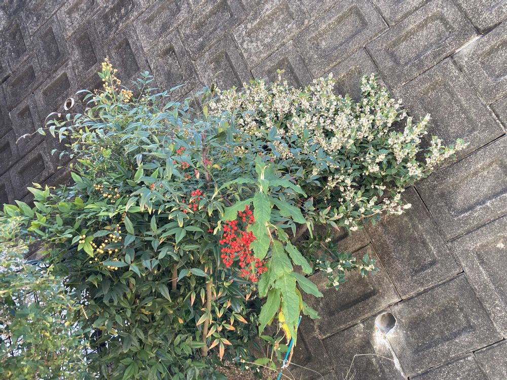 南天 紅白と ヒイラギ木犀 今年は綺麗に咲き揃いました。