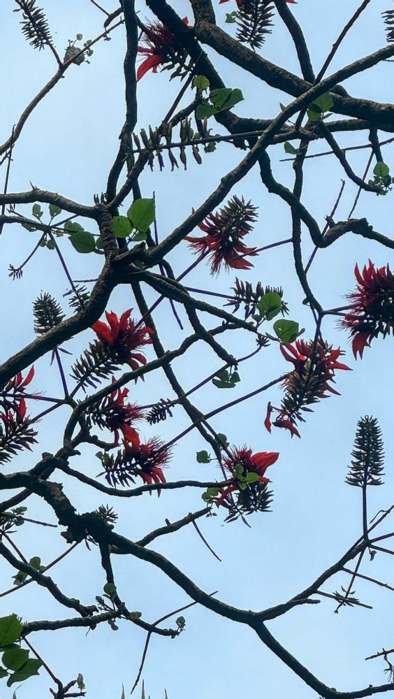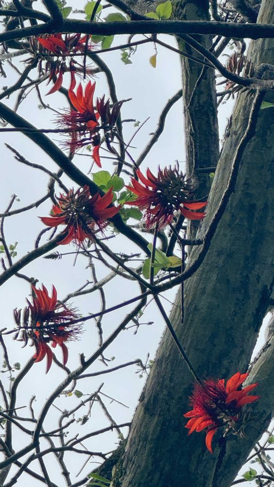 この地のデイゴはいつ咲くのかわからなくて、地面に散った花びらでやっと咲いていることに気づく始末です。もっと近くで撮りたいけれどスマホをズームにしてこれが精一杯でした。💦