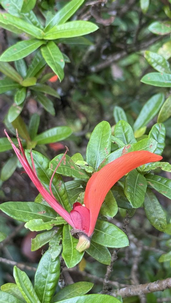 サンタンカの生垣にサンタンカの花ではないオレンジ色の三日月のような花びらが。見上げたら大きな木にデイゴの花が咲いていました。高くてうまく撮れなかったけど確かにデイゴのユニークなシルエット。