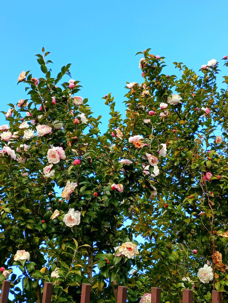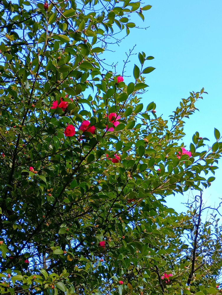 3️⃣4️⃣5️⃣仁徳天皇陵の近くにあった元大阪女子大学の敷地内で山茶花の花🤍💗とクロガネモチの紅い実❤️が青空の下映えていました〜╰(*´︶`*)╯♡