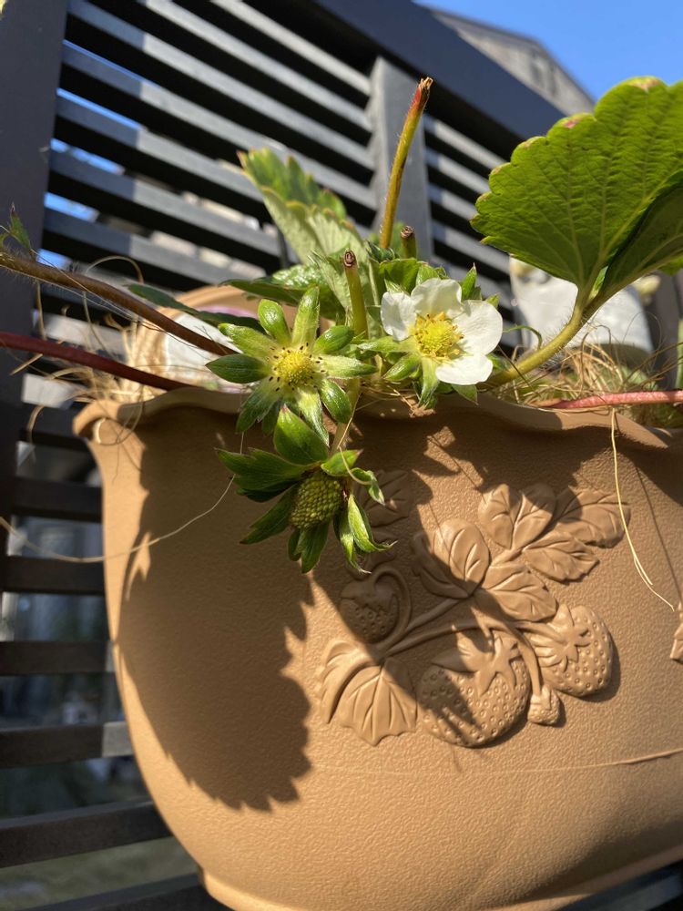 どしたらイイ?のプランター栽培のイチゴ🍓に花咲いてるんだけど😳
