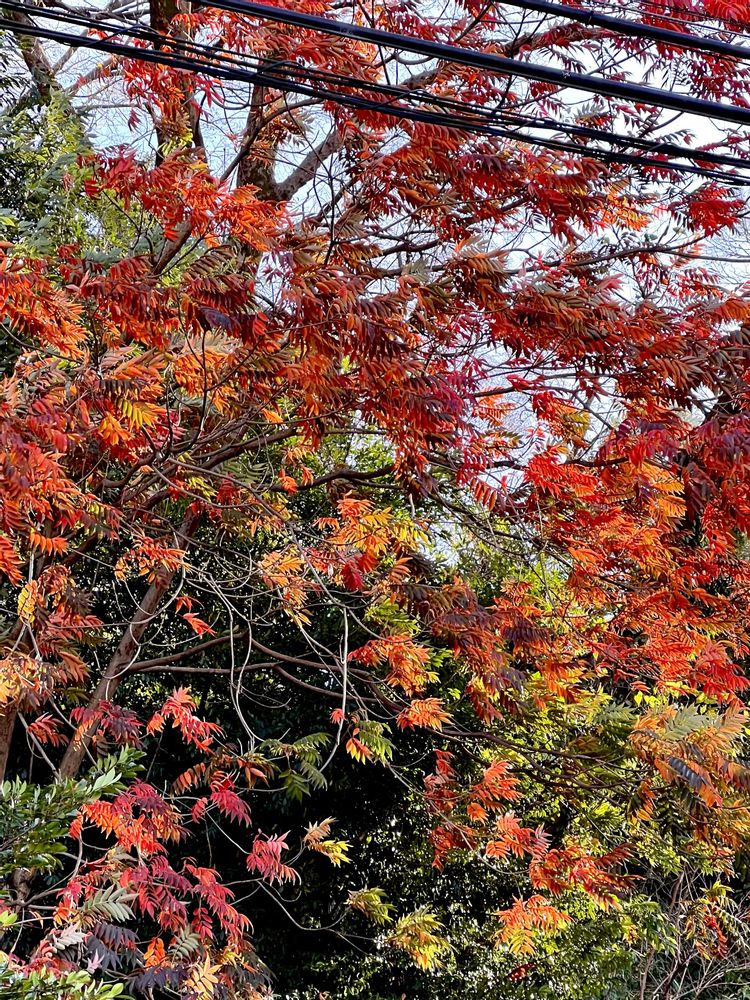 鳥が飛んでるみたいと投稿したハゼノキ、全体が赤く紅葉しました🍁❤️❤️❤️