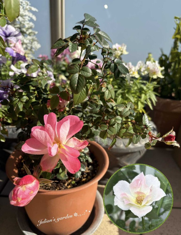 ①8月に名も無きミニバラが↘️のような白くてほんのりピンクの優しい色でしたが 寒くなり蕾も(右の方に小さいのがまだついてますが)赤く 最近開いてきたら 周りが赤くなかが白っぽくてて綺麗です🥰