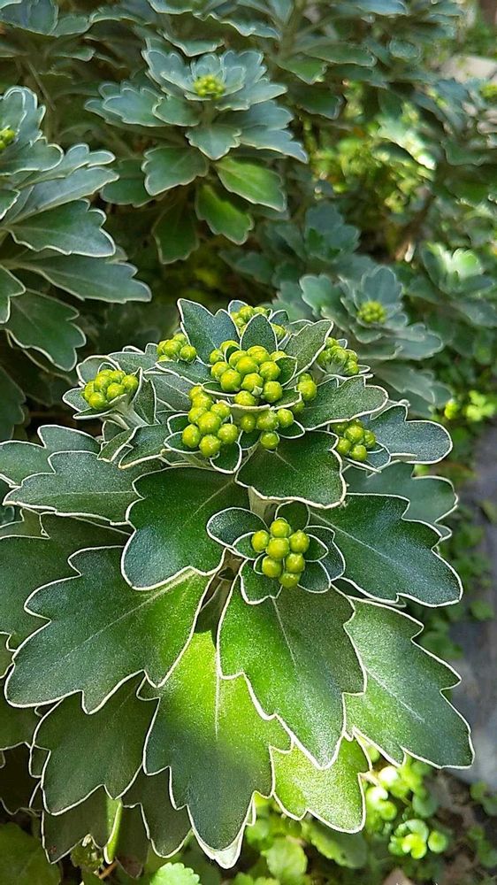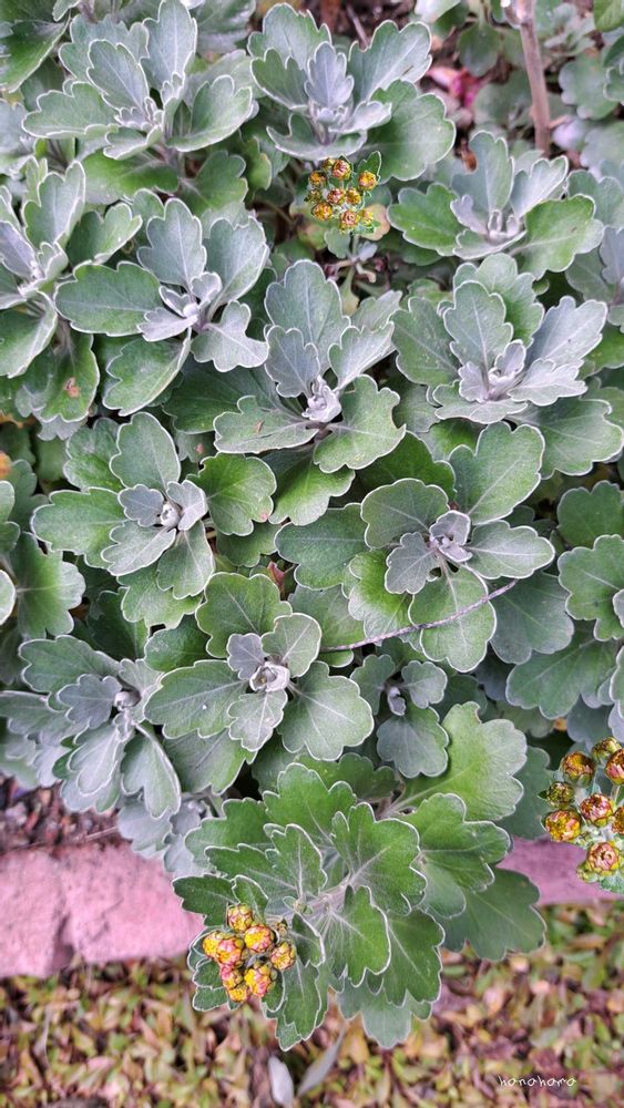 白っぽく見える縁取りは葉裏の銀葉が回り込んで見える物で、花が咲いていなくても美しい縁取りが目を惹きます。