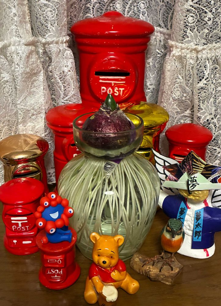 ⑤赤いポスト📮や夢太郎たちに囲まれた「ヒヤシンス」の水耕栽培🪻💙♥️👀