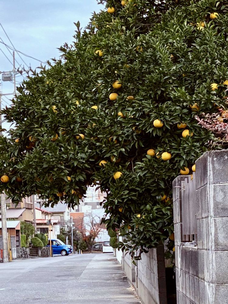 一般各家庭の『 敷地内 』で育てていると思われるみかん----。そのみかんが、塀を乗り越え、はみ出てたわわになって実を付けていました♪。少し心配----、大丈夫なんでしょうか?