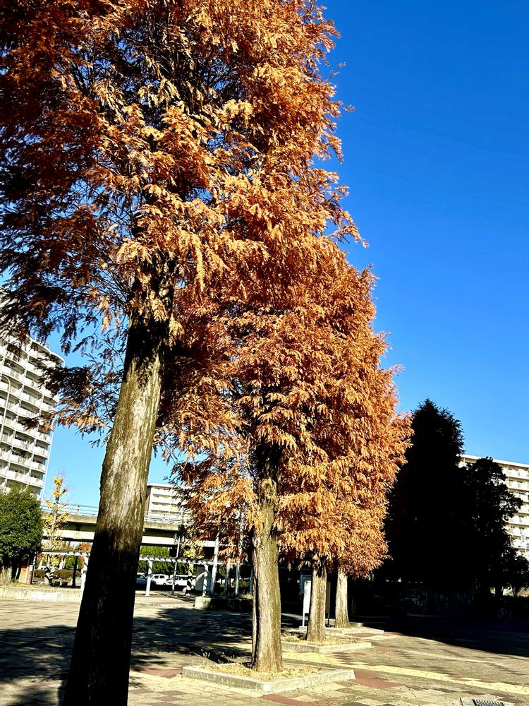 散歩こうえんに向かう商業施設の前に植っているメタセコイアの並木が色付きました🤗一本は枯れていますね😅