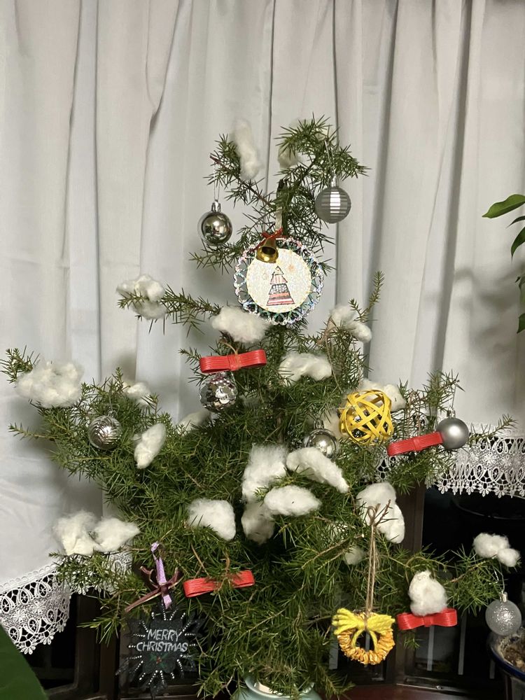 3枚目 生のもみの木に友達から頂いたオーナメントを飾りました。トールペイントされた素敵なオーナメントです😀綿の木で綿を散らし、電飾はしてないけどクリスマスムード🤶
