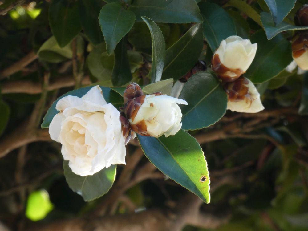 我が家の大きなサザンカは、かつては11月中頃満開の花を沢山咲かせていましたが、最近は12月頃開花の時期を迎え朝夕の寒暖差で十分に咲かずに蕾たちが途中で枯れて、地面にバラバラと落ちてしまう。気候が変わってきたのでしょうか。