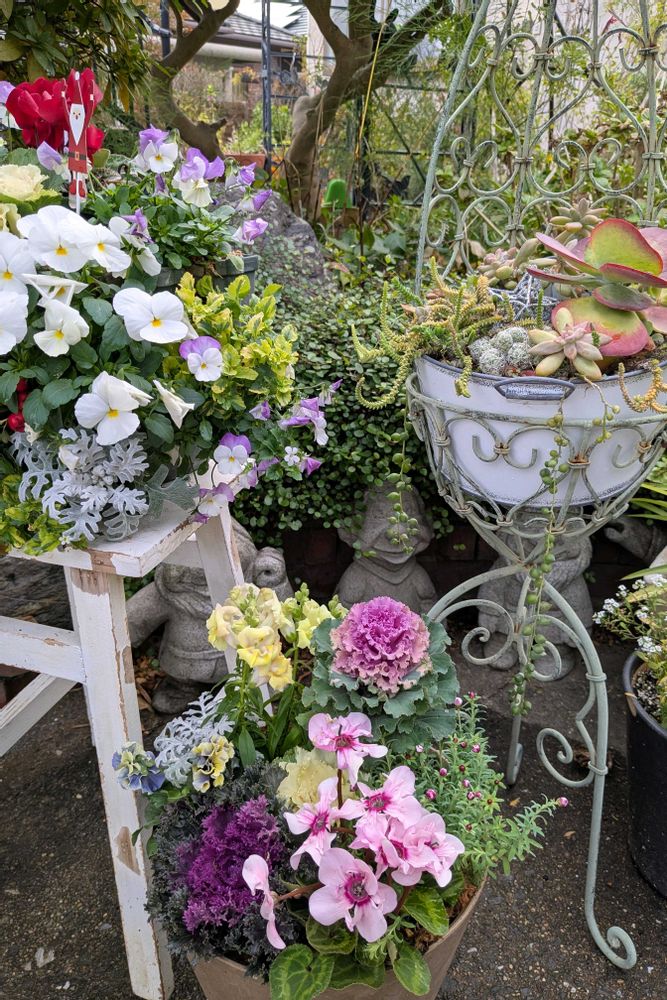 p2先月教室で作ったクリスマス用のハンギングバスケットと一緒に♡♡賑やかで素敵なこちらの一角です とりあえずクリスマスもお正月もお迎えできますねε-(´∀`*)ホッ