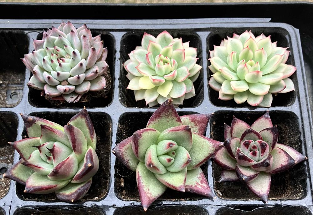 エケベリア熱完全に冷めてますが、6苗1,100円に惹かれ買っちゃった😊エボニー好きなんだけど、暑さに弱くて夏に良く溶けるのよね🫠