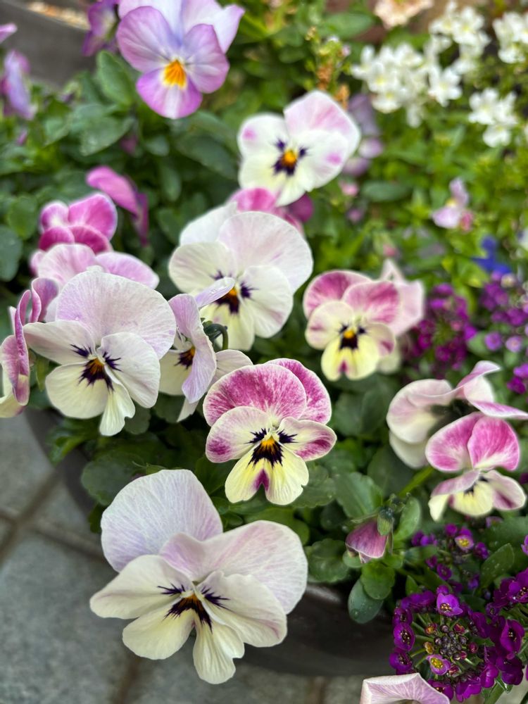後ろに見える紫のビオラ💜『ぴーちももか』💜はお迎えした時はもっと薄い水色🩵だったんだけどなぁ🤔
