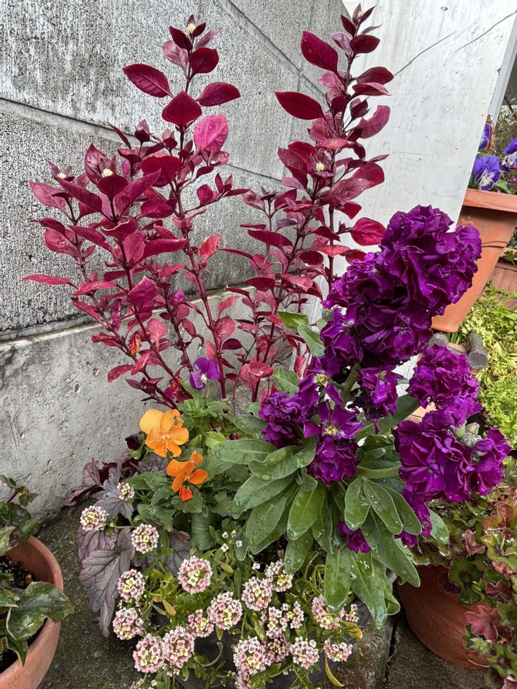 ④10月半ばに植えた道路側の寄せ植えは紫の八重咲きストック💜がモリモリ。赤い葉っぱの『アルテルナンテラ』❤️(アカバセンニチコウ)にも先っぽに白いお花🤍が咲きました。