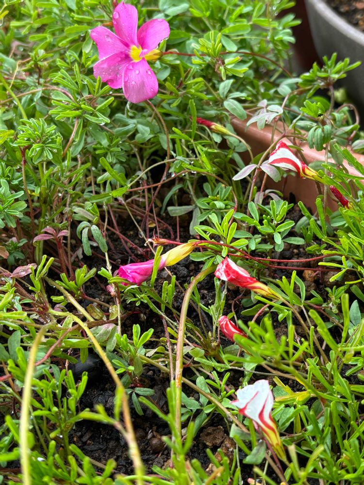 ⑤先住の白と赤の『オキザリスバーシカラー』🤍❤️の空いたスペースに同じオキザリス『桃の輝き』🩷を植えていました。見切り品で100円だったので随分前に植えていましたが、ようやく咲いてくれました。…てか、昼間の晴れた日にしか咲かない感じなので仕事している身にはなかなかお目にかかれません。