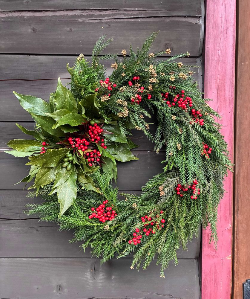 なので 赤い実なしの緑とシダーローズのリースですよ〜😅