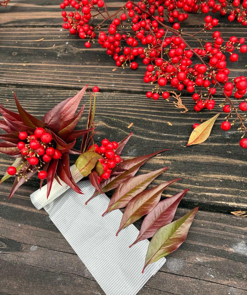 5枚目のナンテンの実と葉っぱのコサージュみたいな花束、とても可愛いです💕