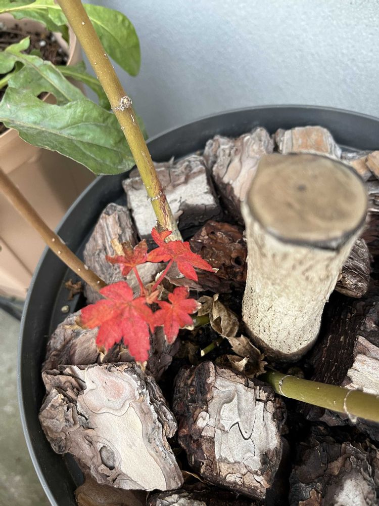 色付く前にほとんどの葉が枯れ落ちましたが、株元にわずかに残った葉だけ紅葉が見られました😊