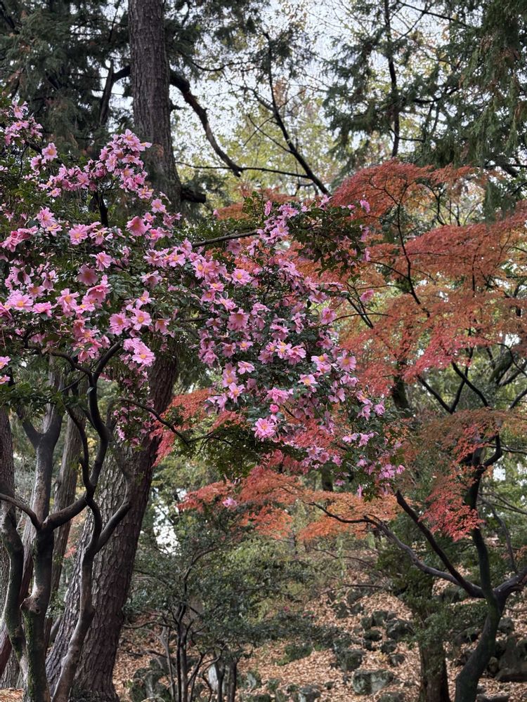 1枚目はランニングコースを振り返って見えた、ピンクのサザンカとイロハモミジの紅葉の共演、周りの濡れた緑が引き立てる