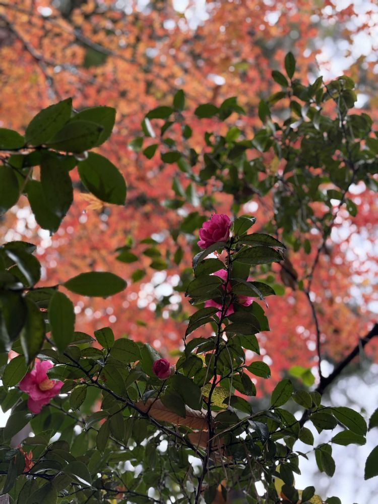 手前にある赤いサザンカを見上げるとその先にイロハモミジの紅葉