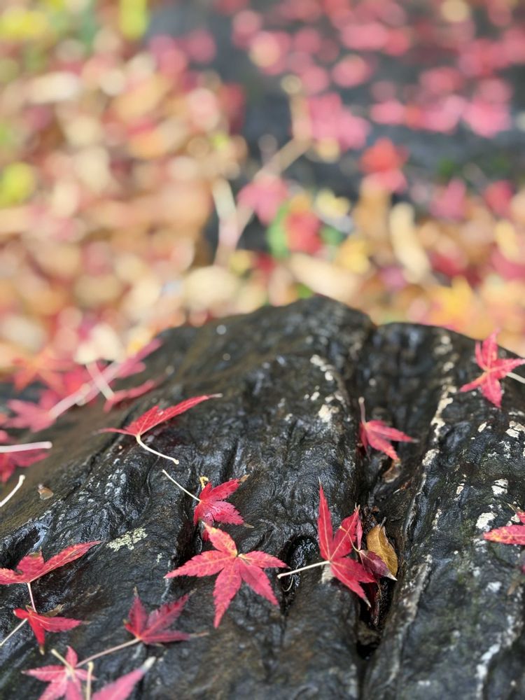 5枚目は下に視線を移すと濡れた黒石に、赤いモミジ