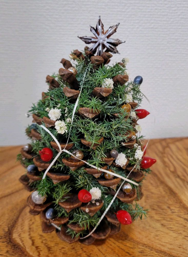 拾ってきた大王松の松ぼっくりでクリスマスツリー。ヒムロスギを適当に差し込んでヘクソカズラやカスミソウをこれまた適当に配置。赤はジュズダマを染めたもの。てっぺんの星はシキミ。