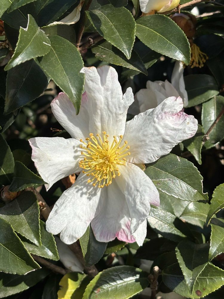 このお堂の前で、山茶花(サザンカ)が咲いていました。よく見ると花びらの先端が薄いピンク色に染まっています。素敵です😊