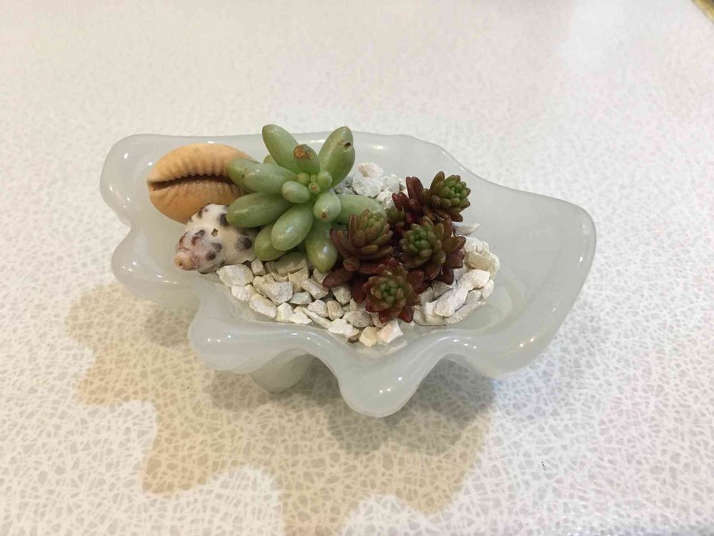 貝殻の形のお皿がカワイくて、夏だ!海だ!って感じの寄せ植えにしました。