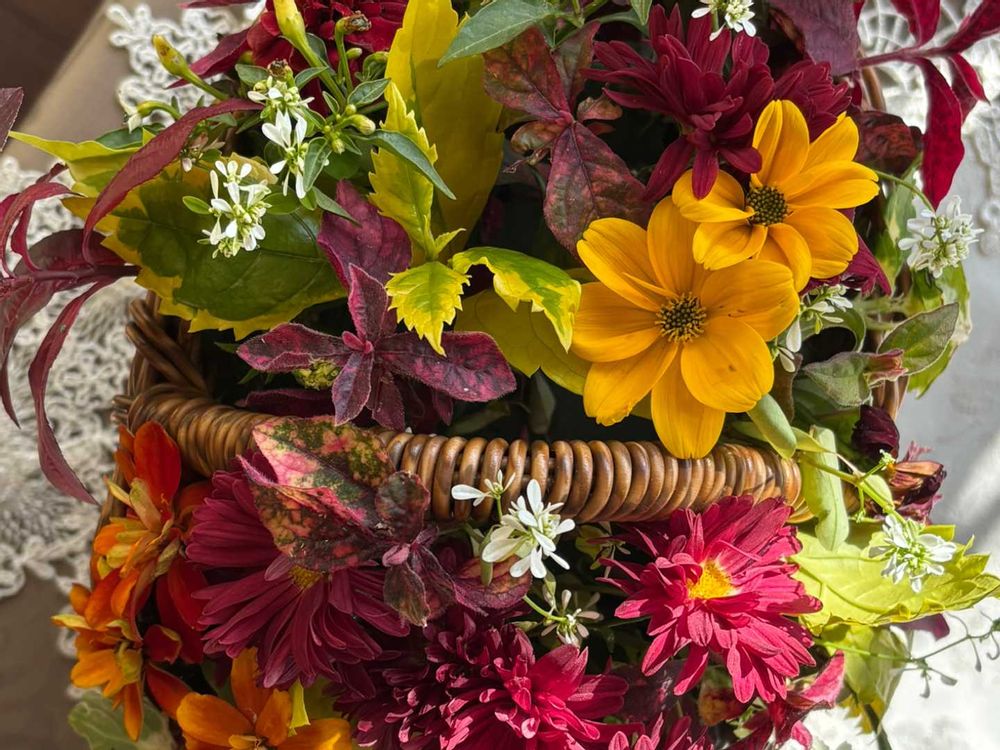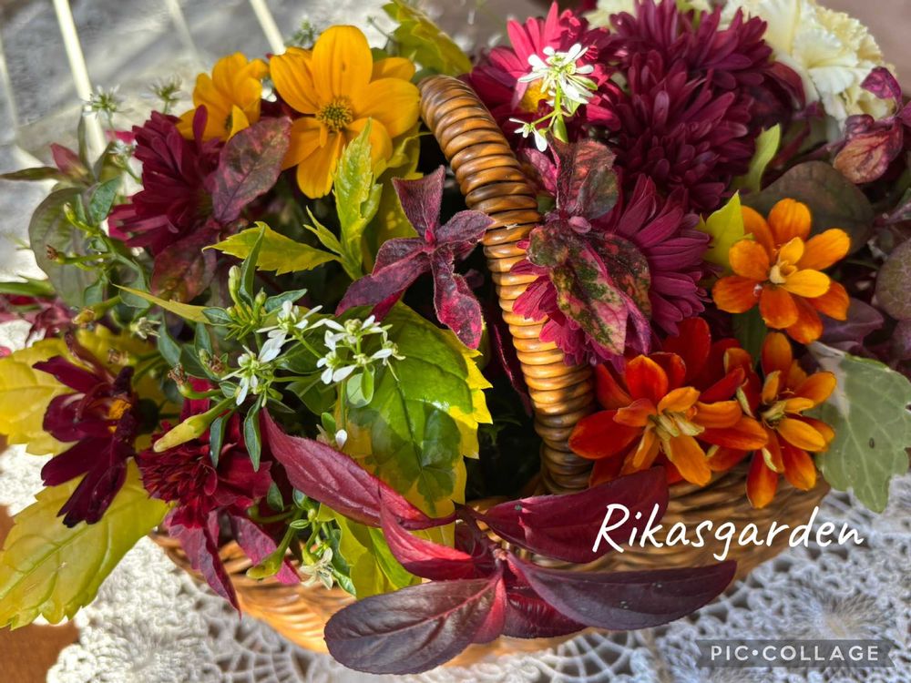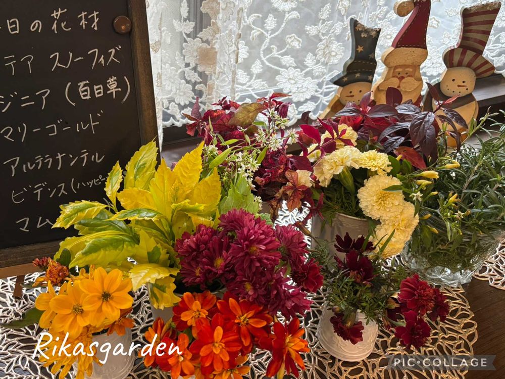 ③庭からなるべく花もちの良い花を集めて準備しました。この時点で好きな色🍁