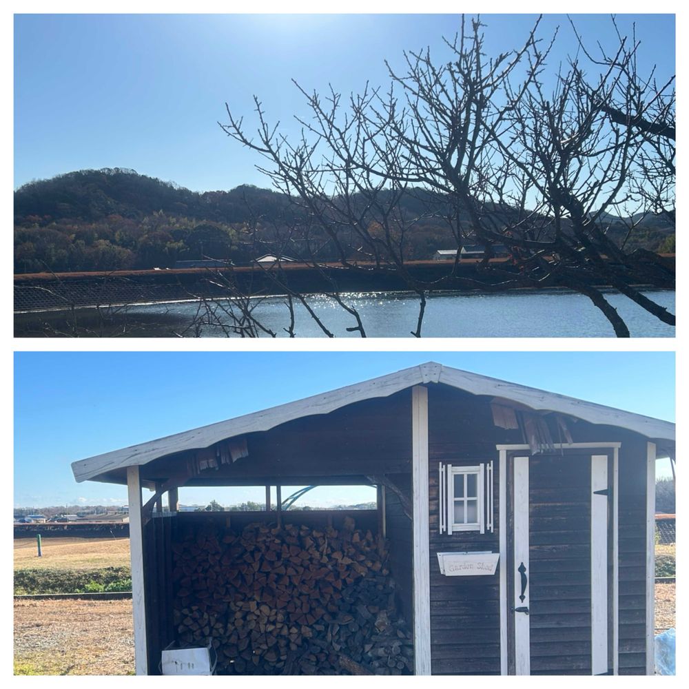向こうに大きな溜池とたくさんの薪🪵が積まれた小屋が側にありました。