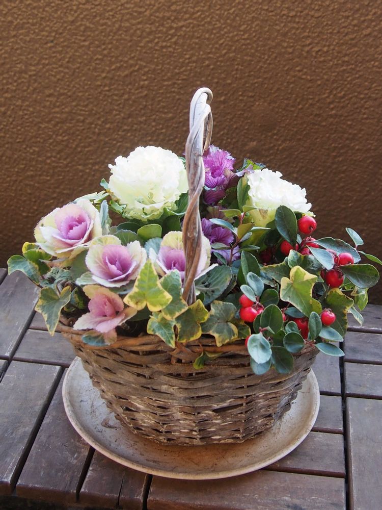 ナチュラルバスケットに!ハボタンとチェッカーベリーの寄せ植え