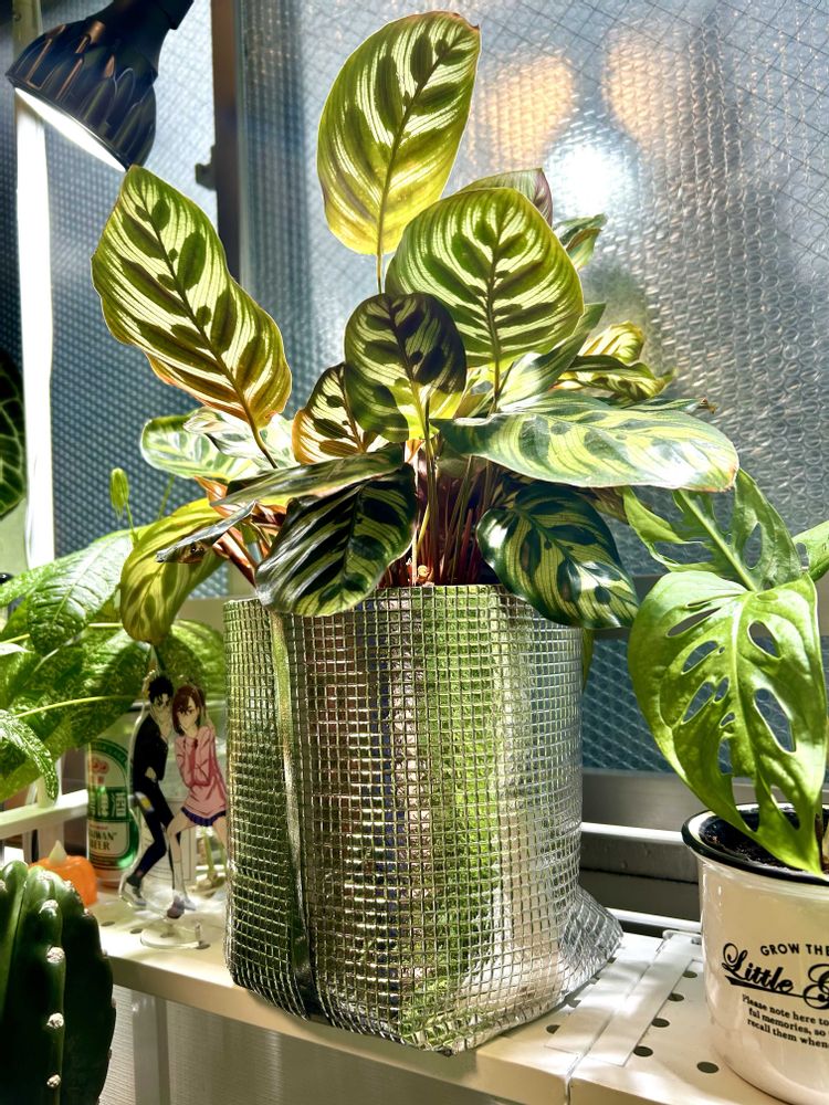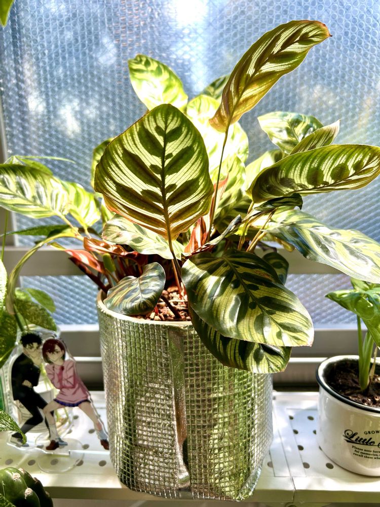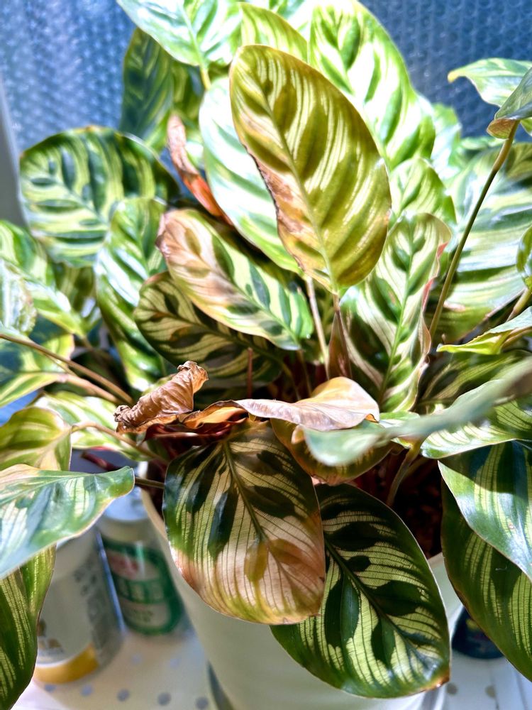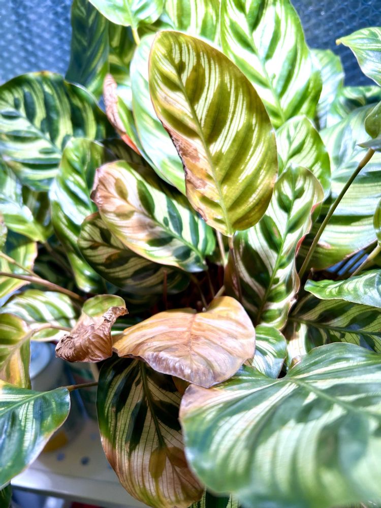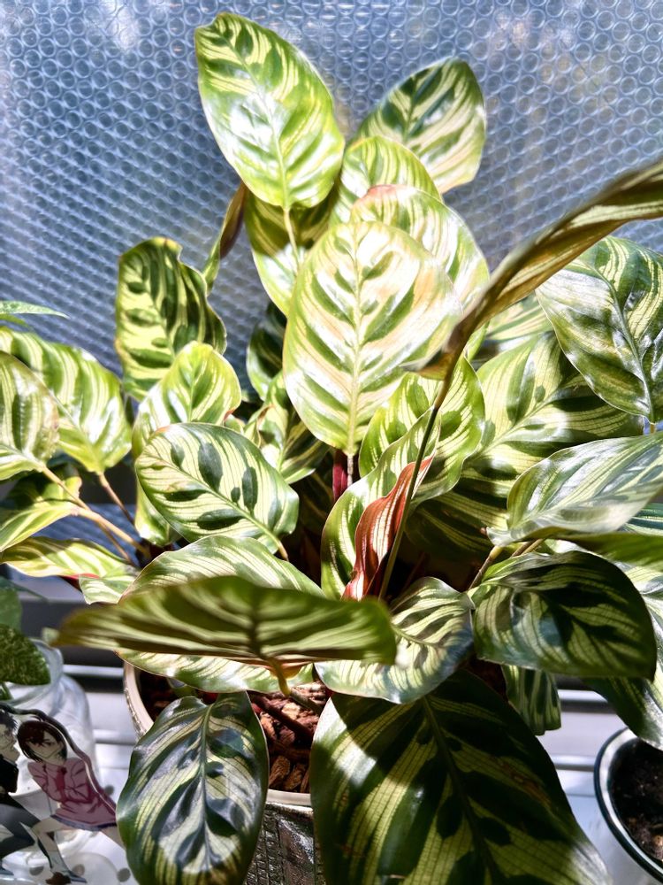 お気に入り😊カラテアマコヤナ😊80枚になった葉っぱも寒さで傷んで来たので30枚くらいカット✂️した😊新芽のストロー🥤も5枚くらい出て来た😊早く春にならないかなぁ😊鉢増しだ😊