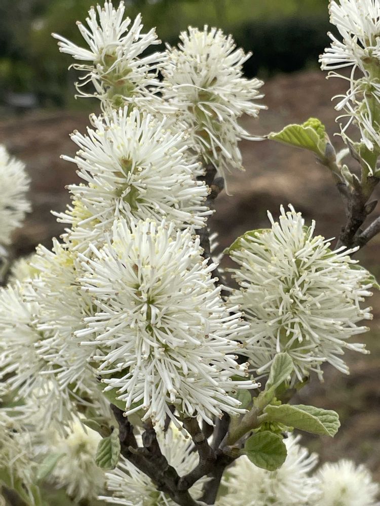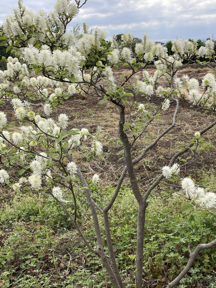 春に白いブラシのような形で、甘く香る花を咲かせます(円の中)