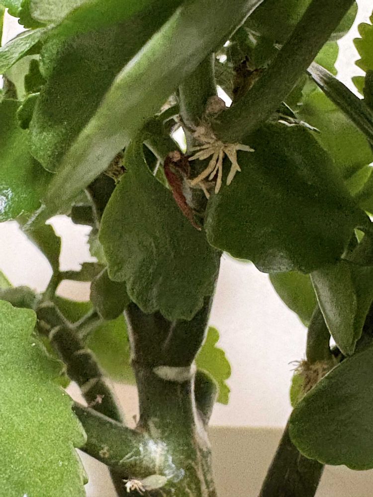 カランコエの「空中発根」とは、茎の途中から根(気根)が生えてくる現象です。