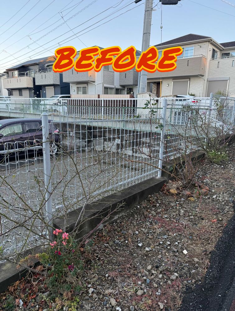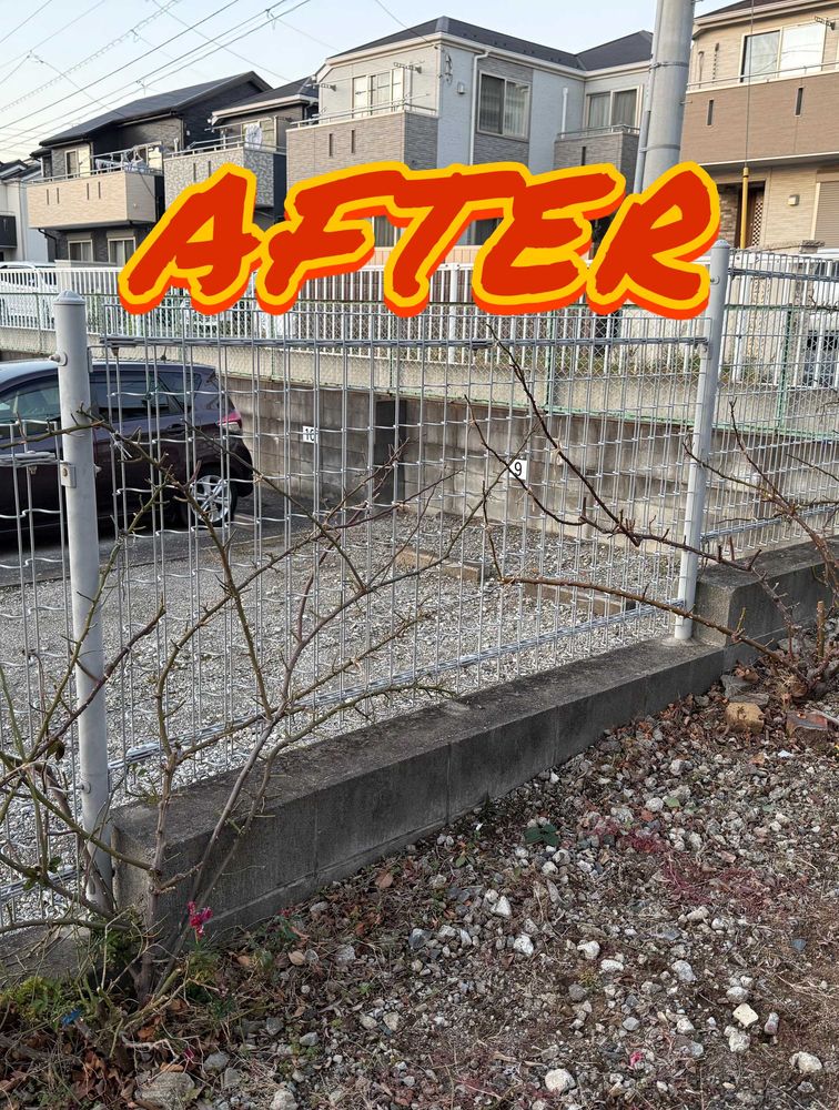 Before and after training the climbing rose "Rainy Blue." This is a rose being trained in the parking lot of Miyo Garden. 🌹 The thick, lush branches were a real challenge! If we can keep this many branches for Rainy Blue, we can expect plenty of flowers next year. ✨