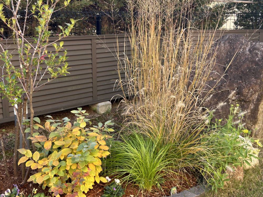 ②グリーンの葉っぱのカレックスとカラマグロスティス〜の間には来年咲く予定のメキシカンハットが植栽されました🎩