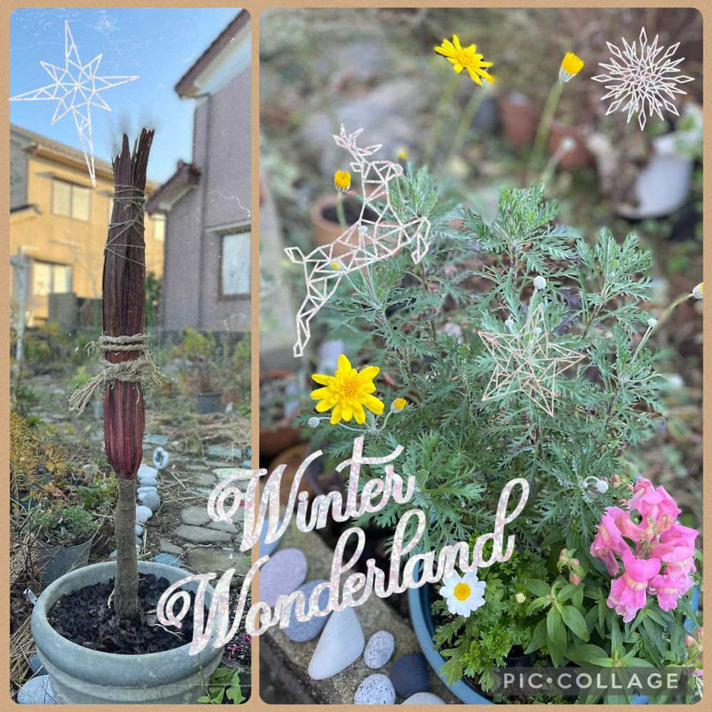 ①冬支度のコルジリネと今咲いている花