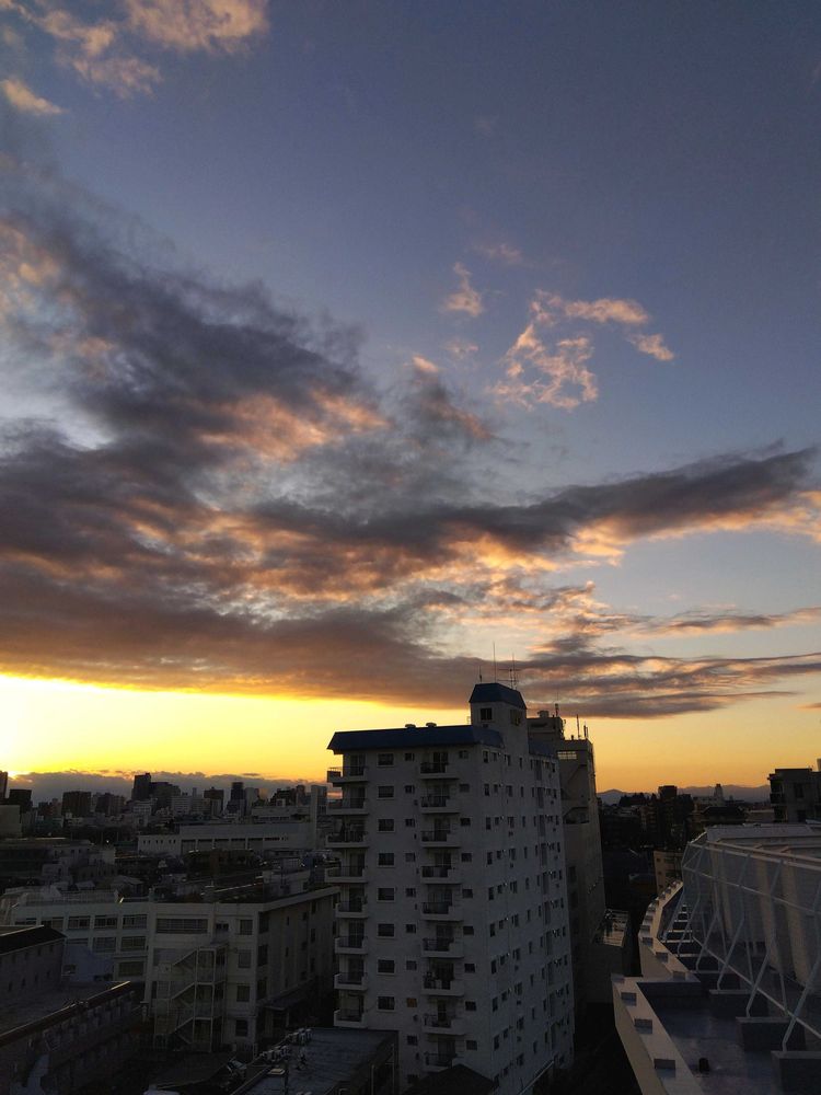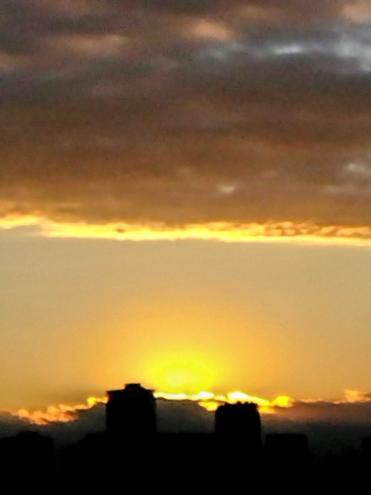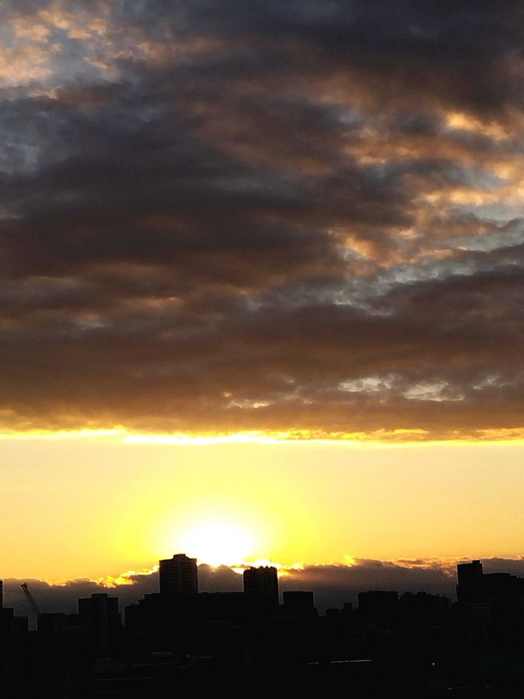 厚い雲が覆う空のした夕陽が沈んでゆく