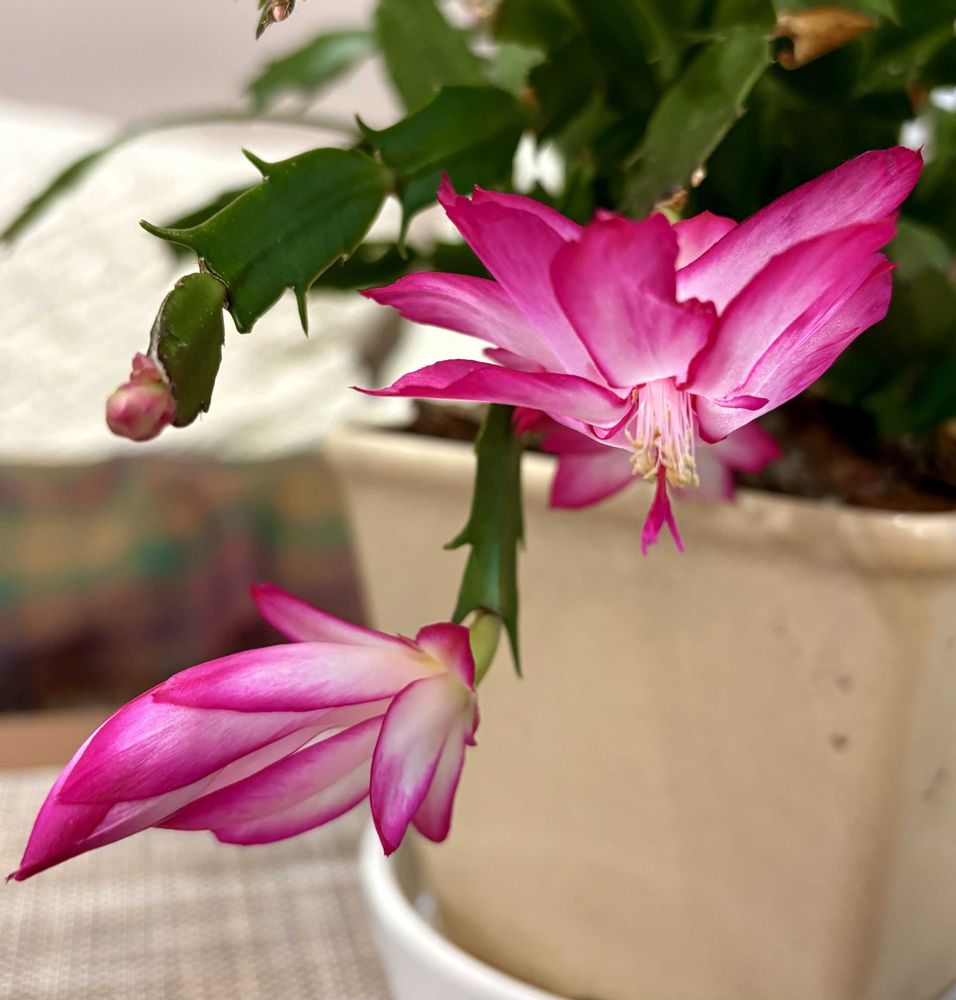今年四年目を迎えた。『デンマークカクタス(シャコバサボテン)』さん。(赤、ピンク、白)白除く、2色。咲き始めてきました。