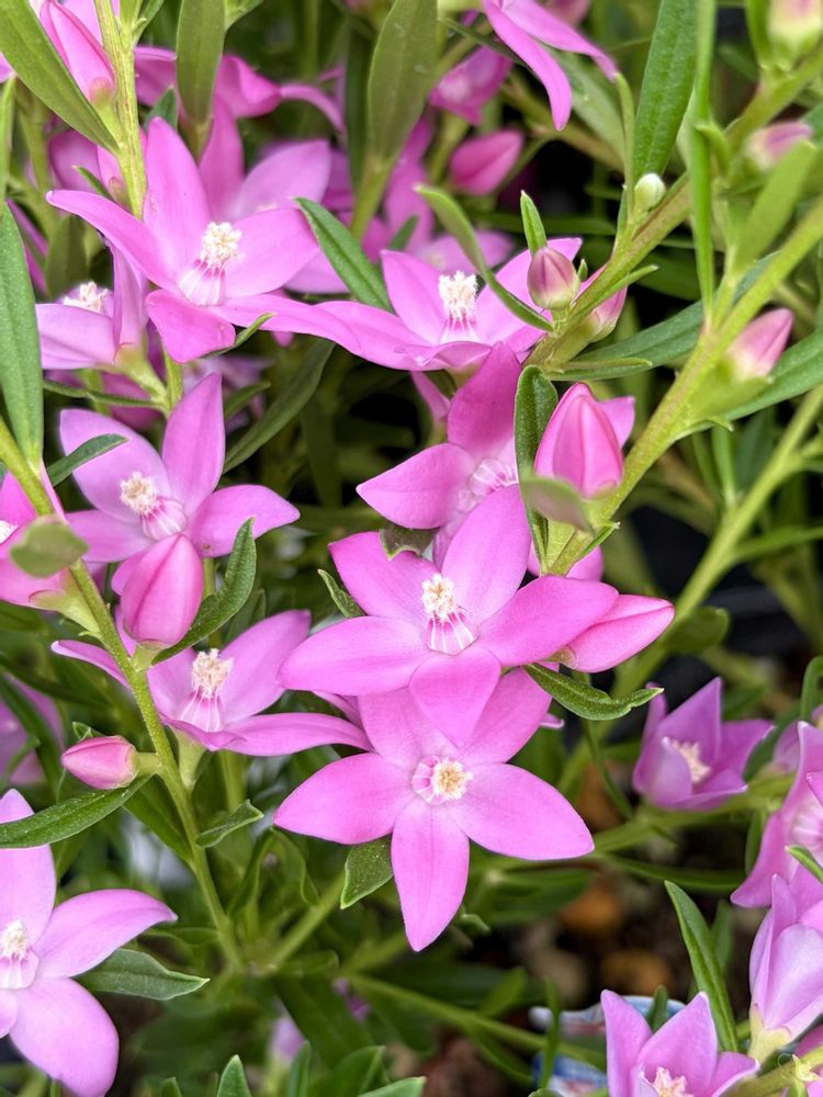 花期が長いオーストラリア原産の花です。星形のかわいらしい花(ピンクや白)を咲かせ、別名「クロウエア」とも呼ばれています。