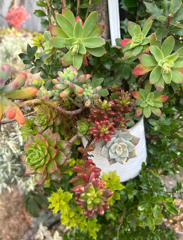 作ってから丸三年が経過しましたが、多肉たちが紅葉していないと、茂るヒイラギの葉と同化してしまい、あまり見分けがつきにくい状態でした。