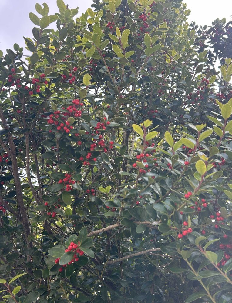 2本の大きなヒイラギの木にびっしりと生っているこの赤い実も、毎年年末には様々な鳥たちが食べてスッカラカンになります。