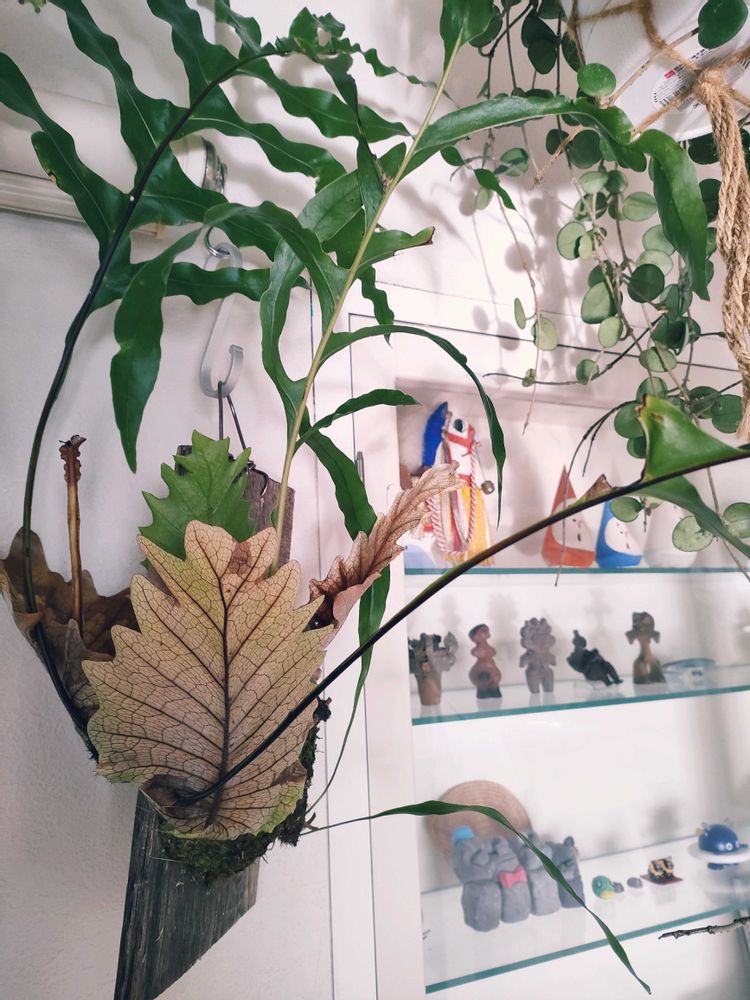 板を覆いそうなので、唯一まだ覆われていない木面を壁側にして強引に壁掛け。壁に対して斜めってる&ちょっと葉っぱ当たってるけれど💦