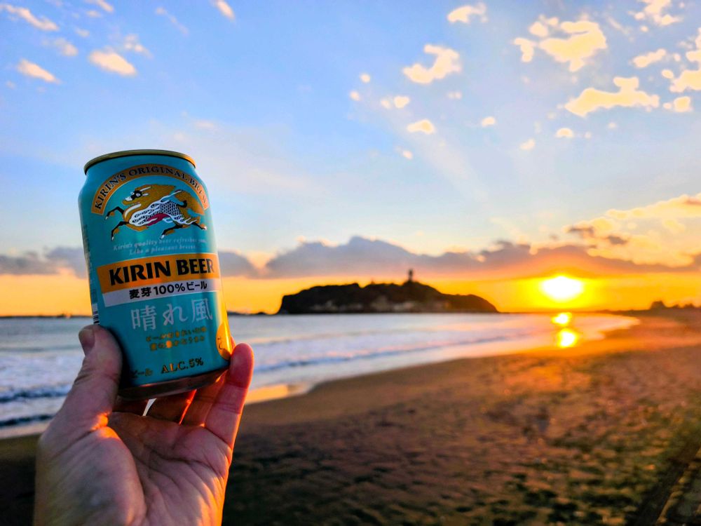 最後は記念に夕日を眺めながらビールを飲んでこの日の山歩き海歩きを終えたハッピーフライト♪