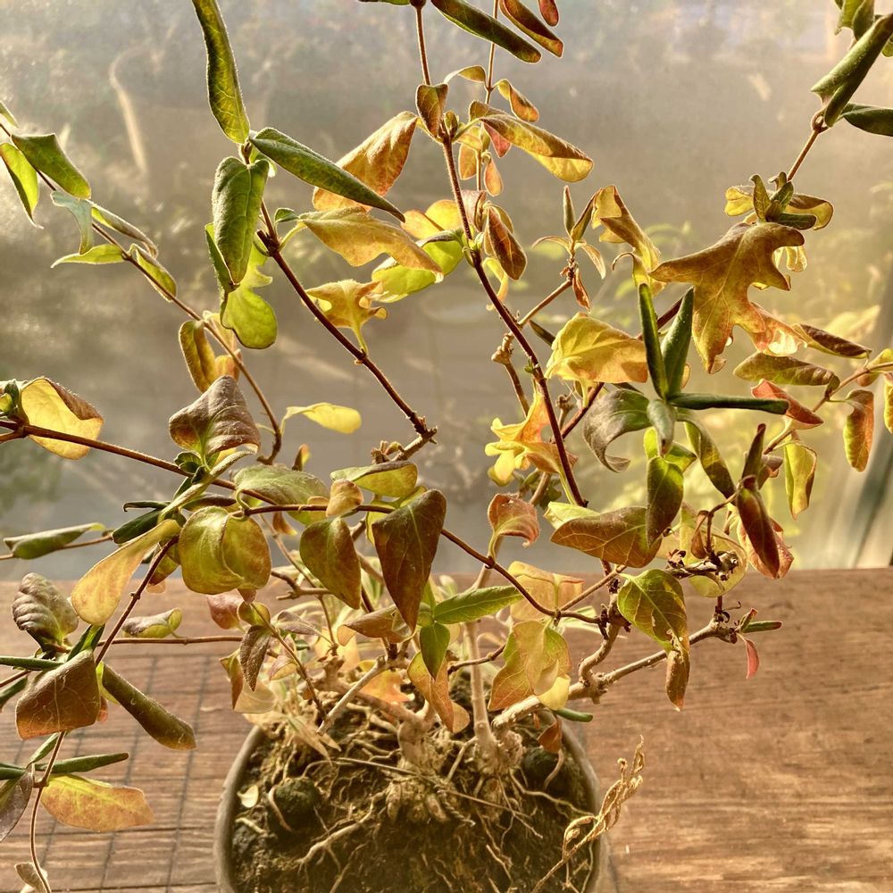 スイカズラがやっと紅葉しました。冬でも葉が落ちないと言われますが、紅葉はします。根本にあるのははチゴザサです。